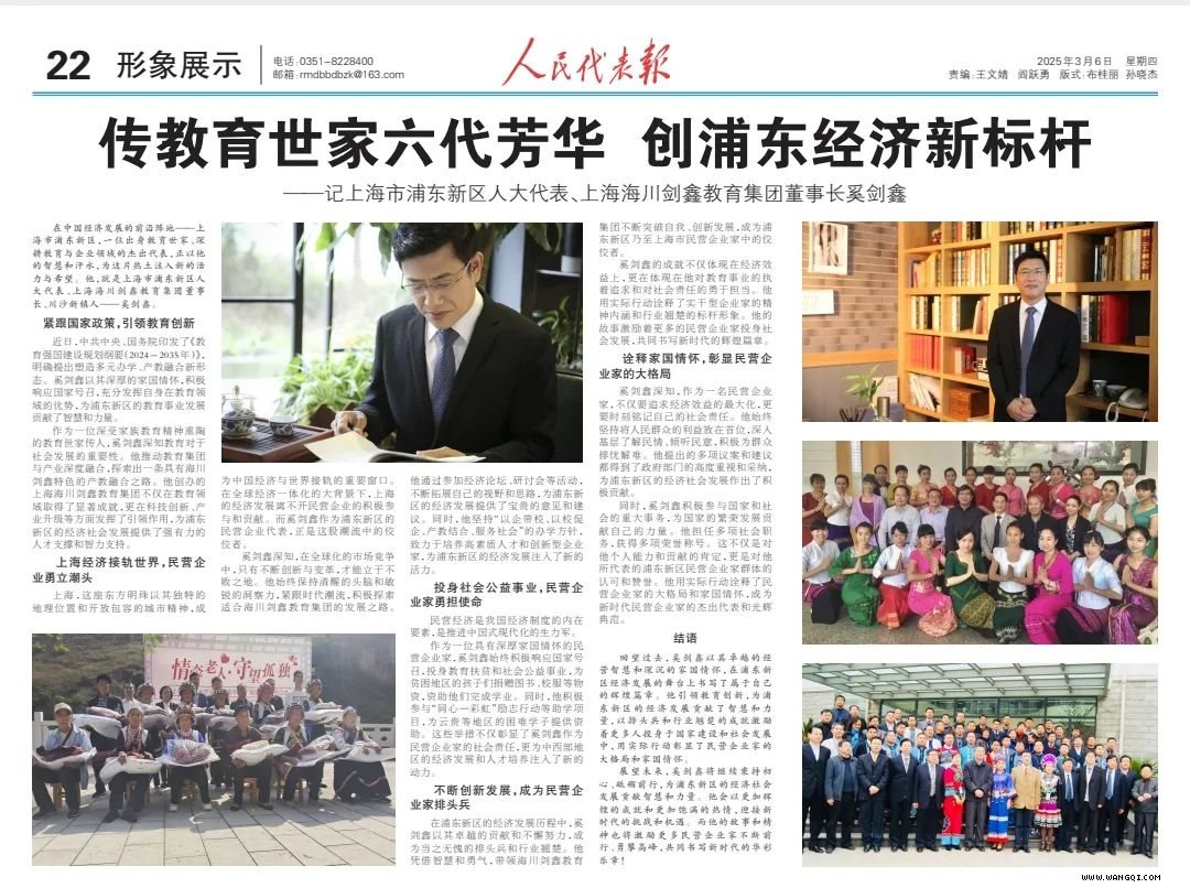 近日,奚剑鑫的事迹荣登《人民代表报》。作为一名人大代表,奚剑鑫积极履职。他深入调研,提出多项建设性提案,尤其是针对教育资源分配不均,多次实地考察,为优化教育布局建言献策。其种种努力和付出,都被记录在《人民代表报》中,充分展现出新时代人大代表的担当与风采。作为企业负责人,他深耕教育与企业管理领域,积极推动教育创新与产业融合,带领海川剑鑫教育集团在民营企业中脱颖而出。他不仅注重经济效益,还积极履行社会责任,参与教育扶贫和社会公益事业。