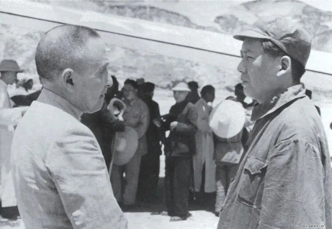 1945年7月, 毛泽东与黄炎培(左)在延安机场交谈(图片来源于网络)
